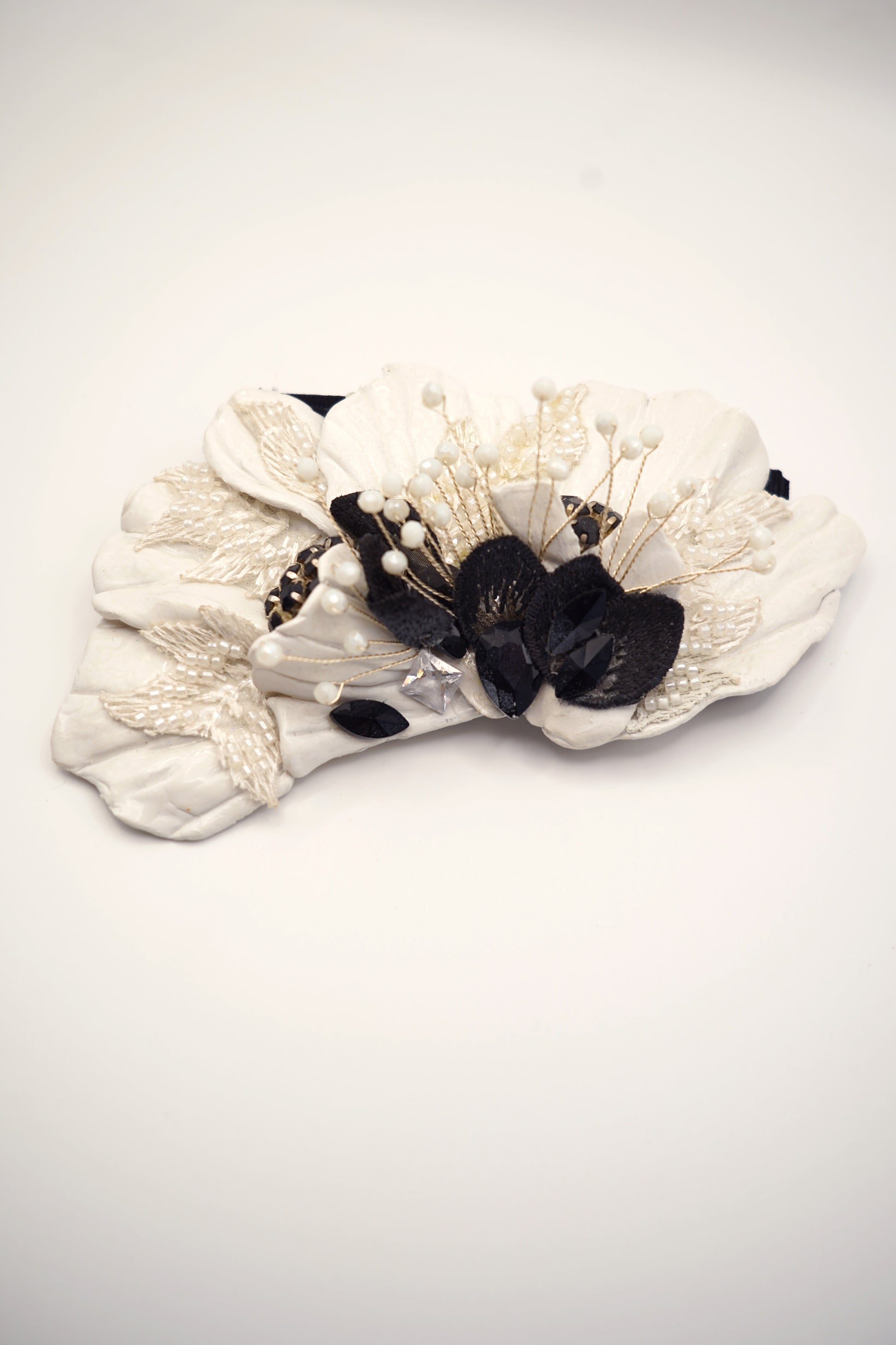 El tocado Amapola Noir combina el contraste del blanco porcelana con acentos negros profundos y destellos dorados, evocando elegancia moderna y minimalismo refinado.