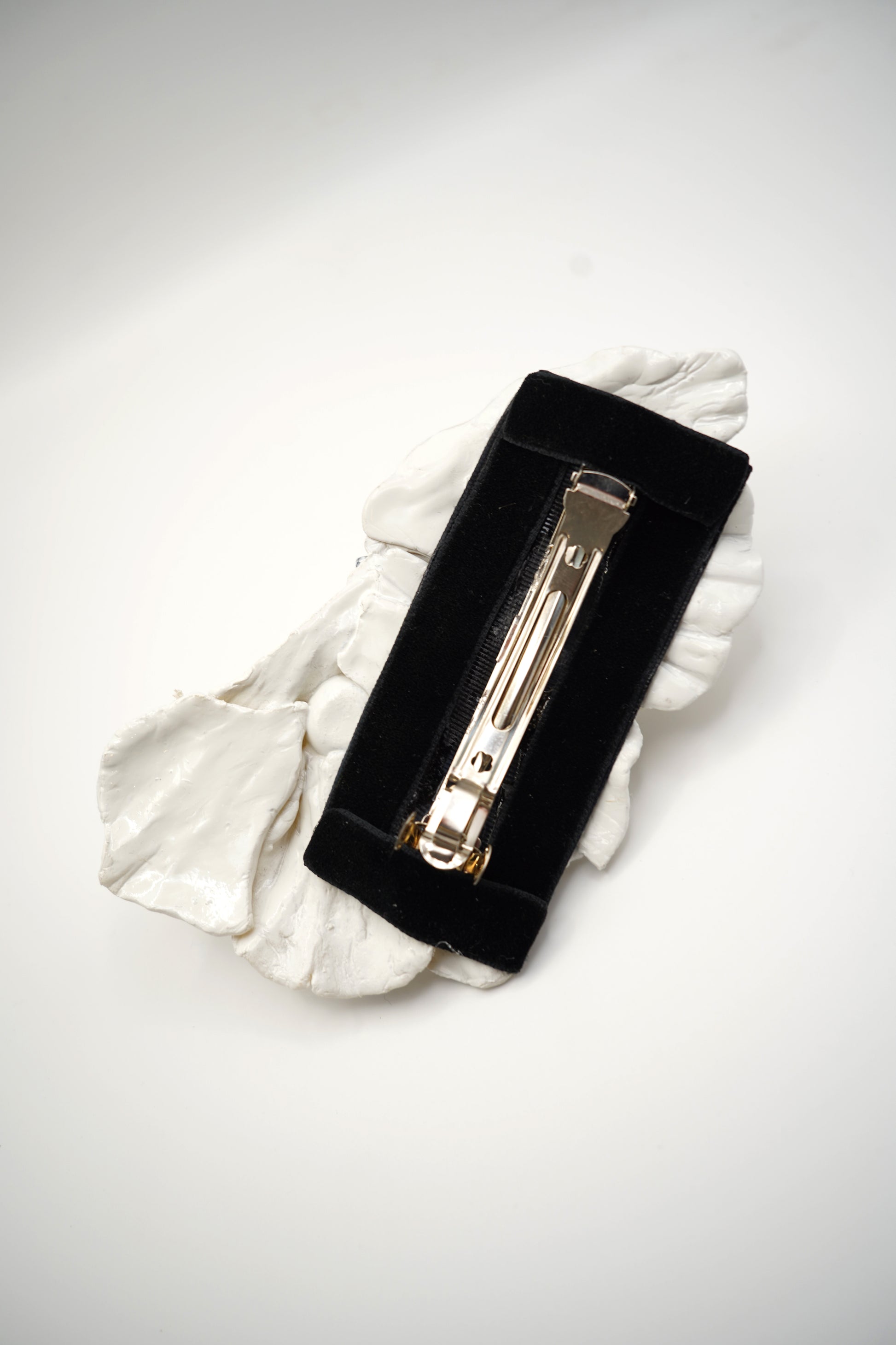 Su cierre tipo traba, forrado en terciopelo negro, permite un ajuste seguro y discreto, ideal para complementar recogidos o peinados sueltos.