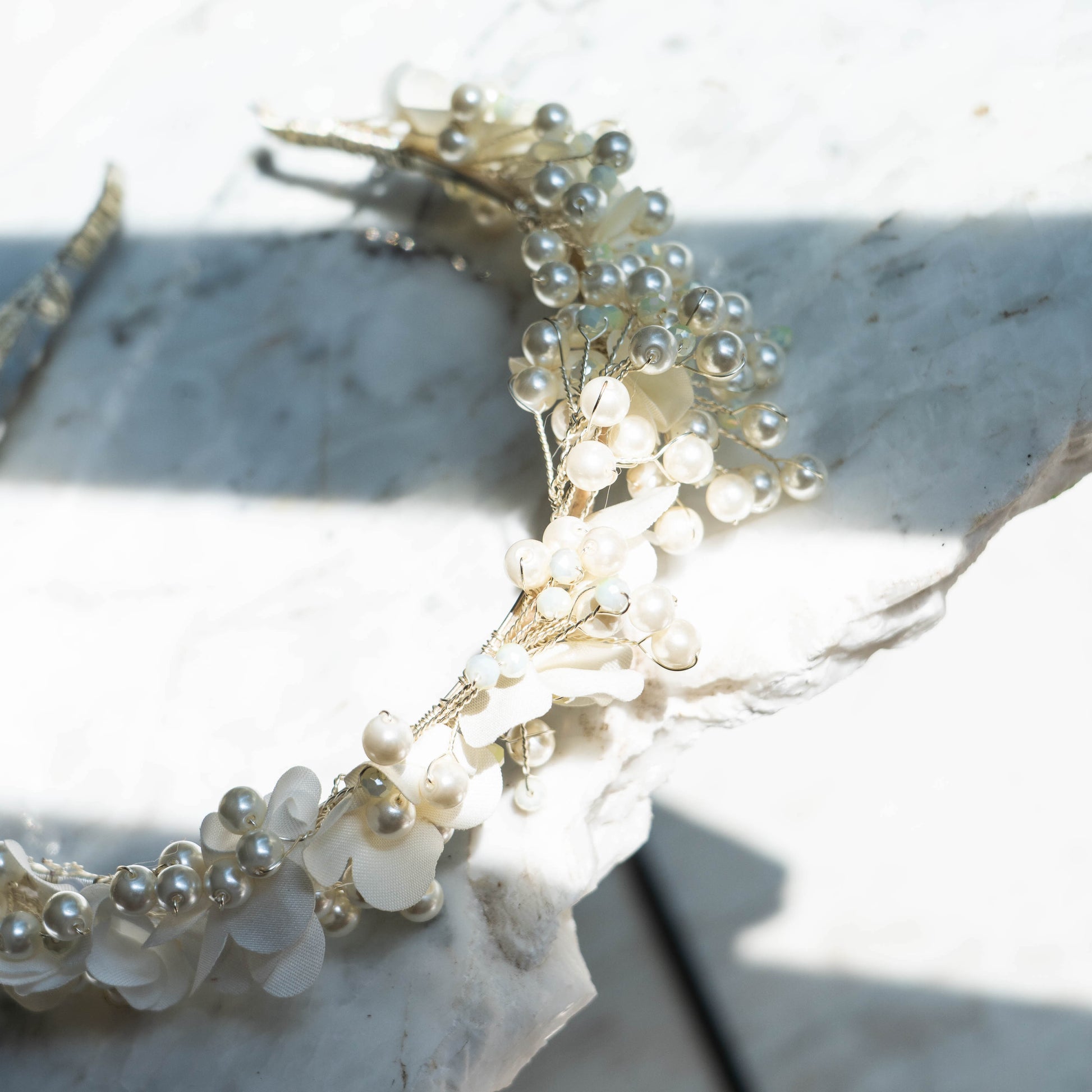 Tiara Perlas Blancas, Muy Clasic! Cintillo Metalico Estándar, cubierto por una cantidad de perlas blancas tejidas con alambre de plata, mas mini flores blancas componiendo un clasico!