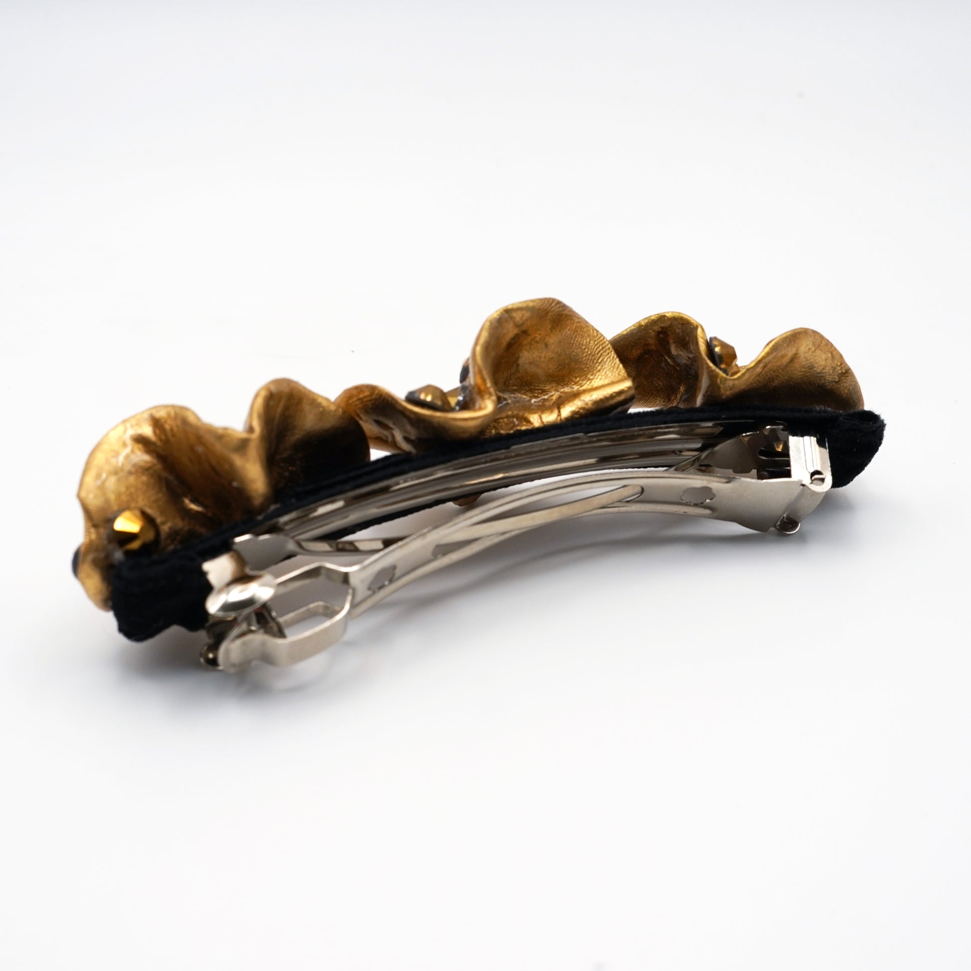 Traba Petalos Dorados, elegancia Informal Petalos Dorados, y Cristales Dorados, sus Flores son moldeadas a mano con porcelana fria, mas un baño de acrilico dorado, terminando sobre los petalos, cristales dorados.
