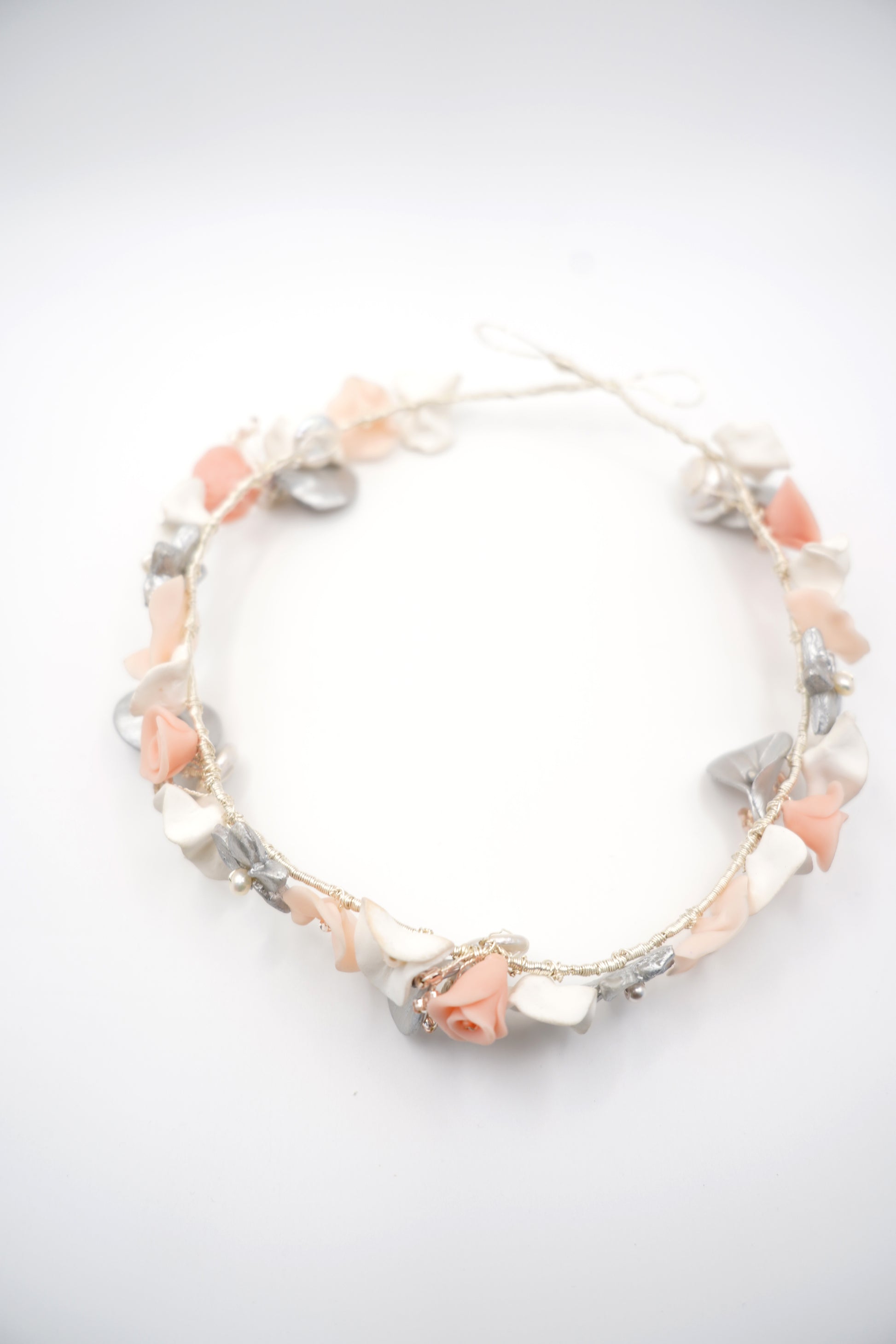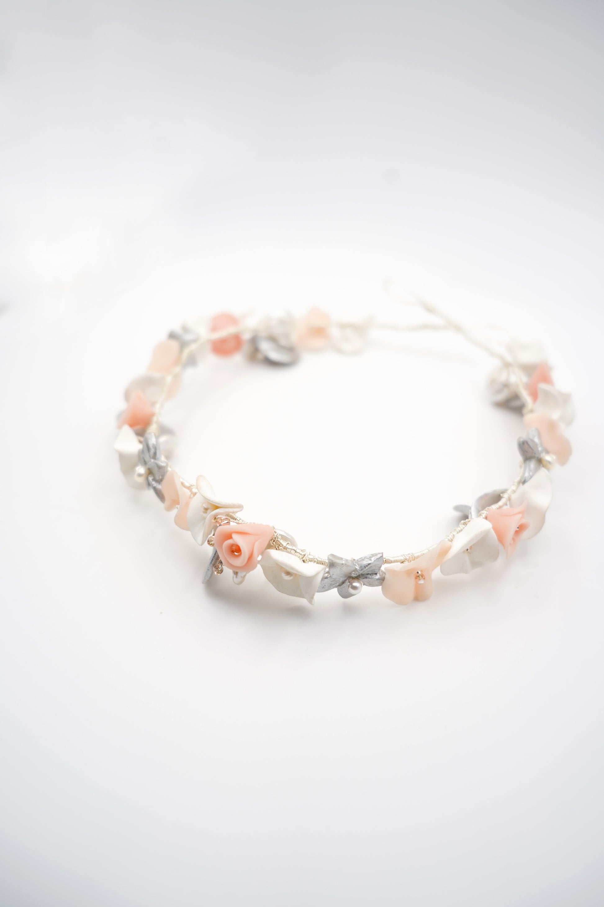 Hada te invita en una larga corrida de flores en tonos pasteles en transformar tu cabello. Delicadez y magia destacan en este tocado.