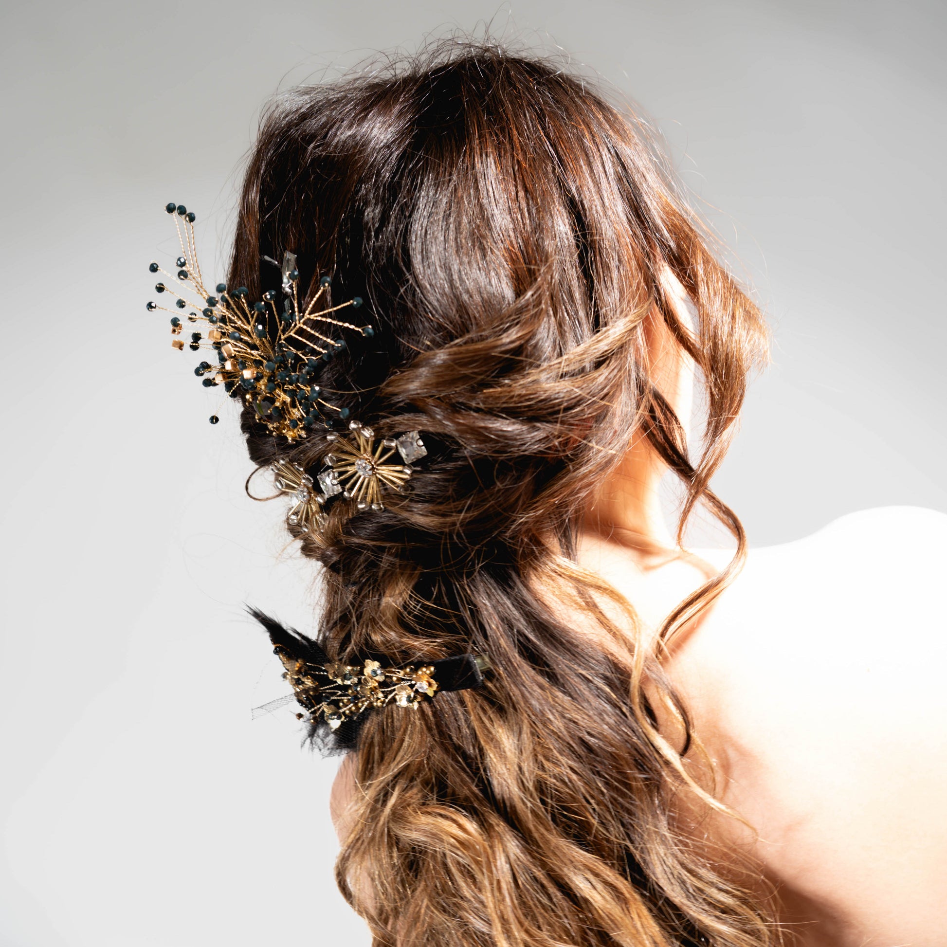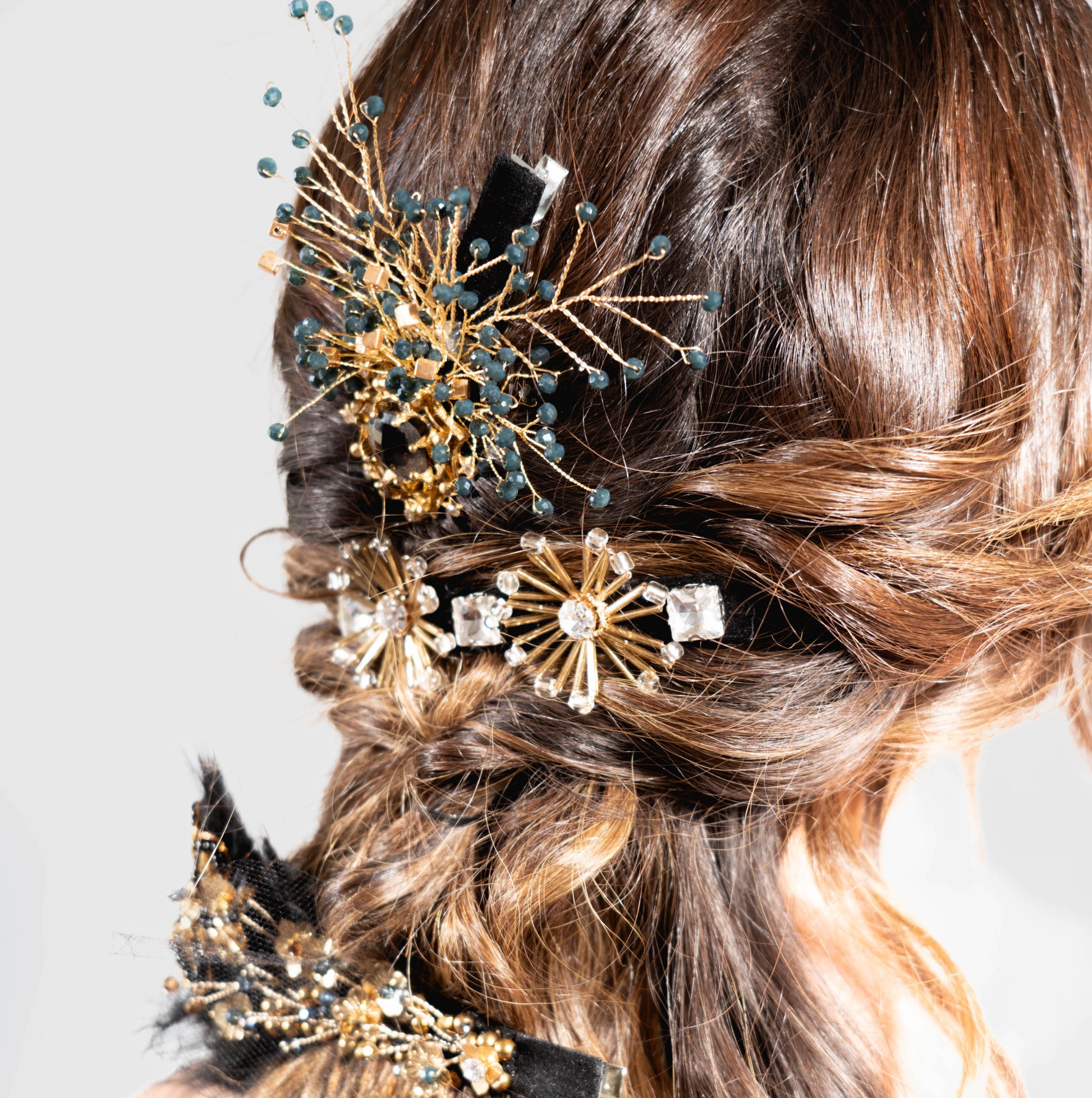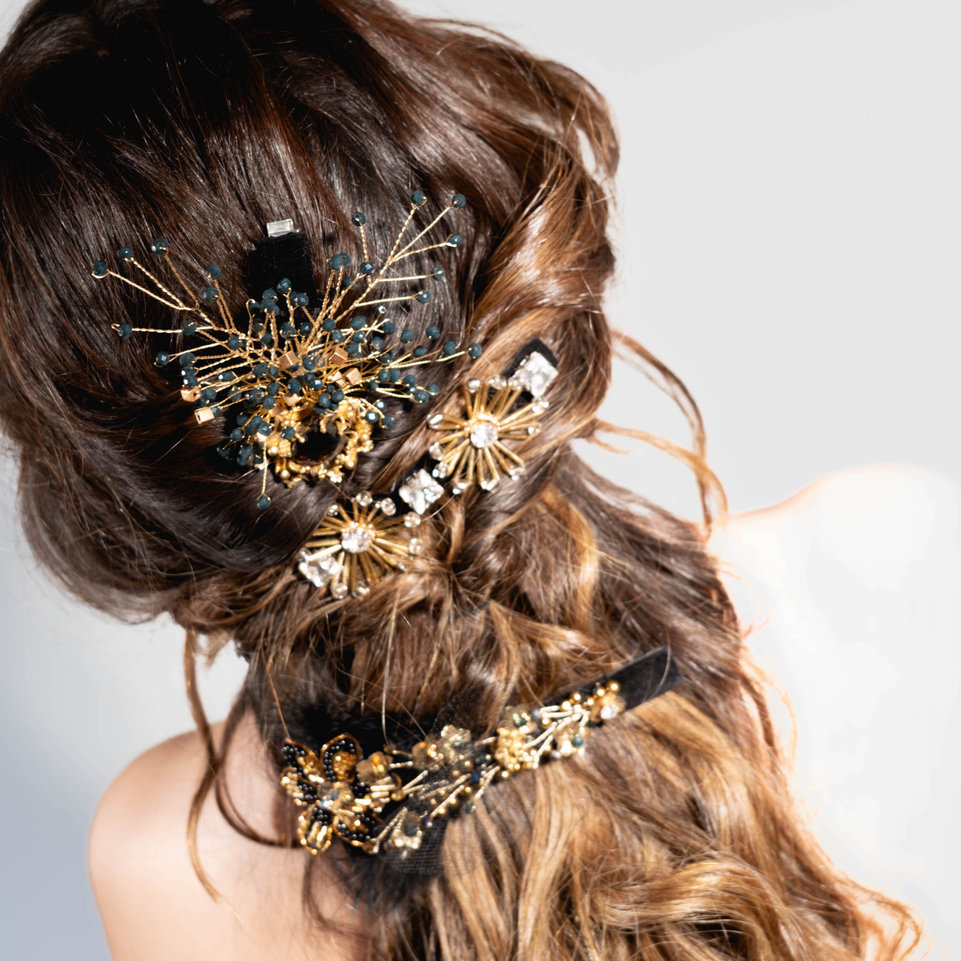 Este Conjunto Muy Magico! Esta compuesto por tres pinches que van armados con mostacillas, negras, doradas, cristales, alambres bañados en dorado. Simulando flores de canutillos con centros brillantes…logrando un Estilo artistico y creativo. Su uso se lo podras dar segun el peinado que quieras llevar. Atrevete!!