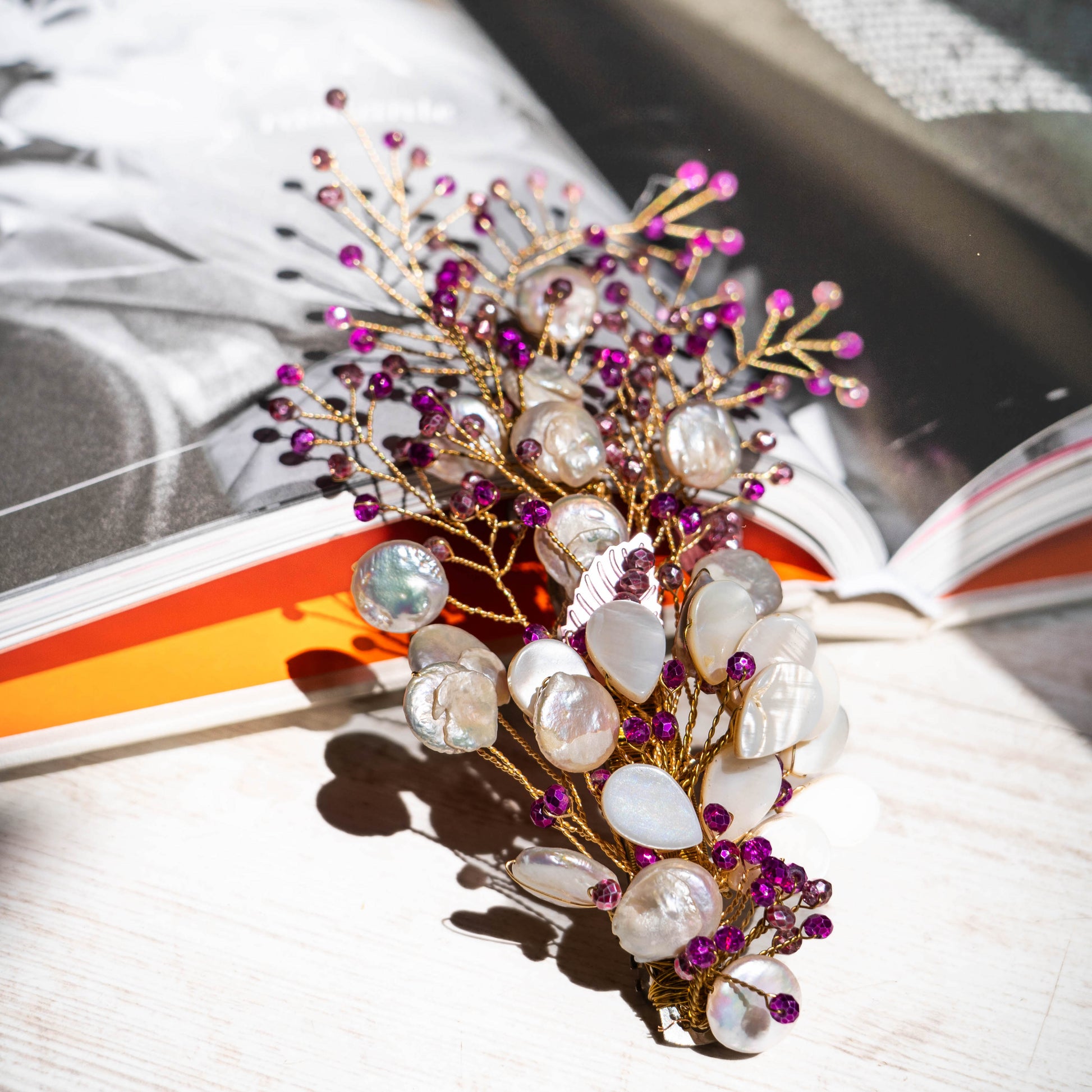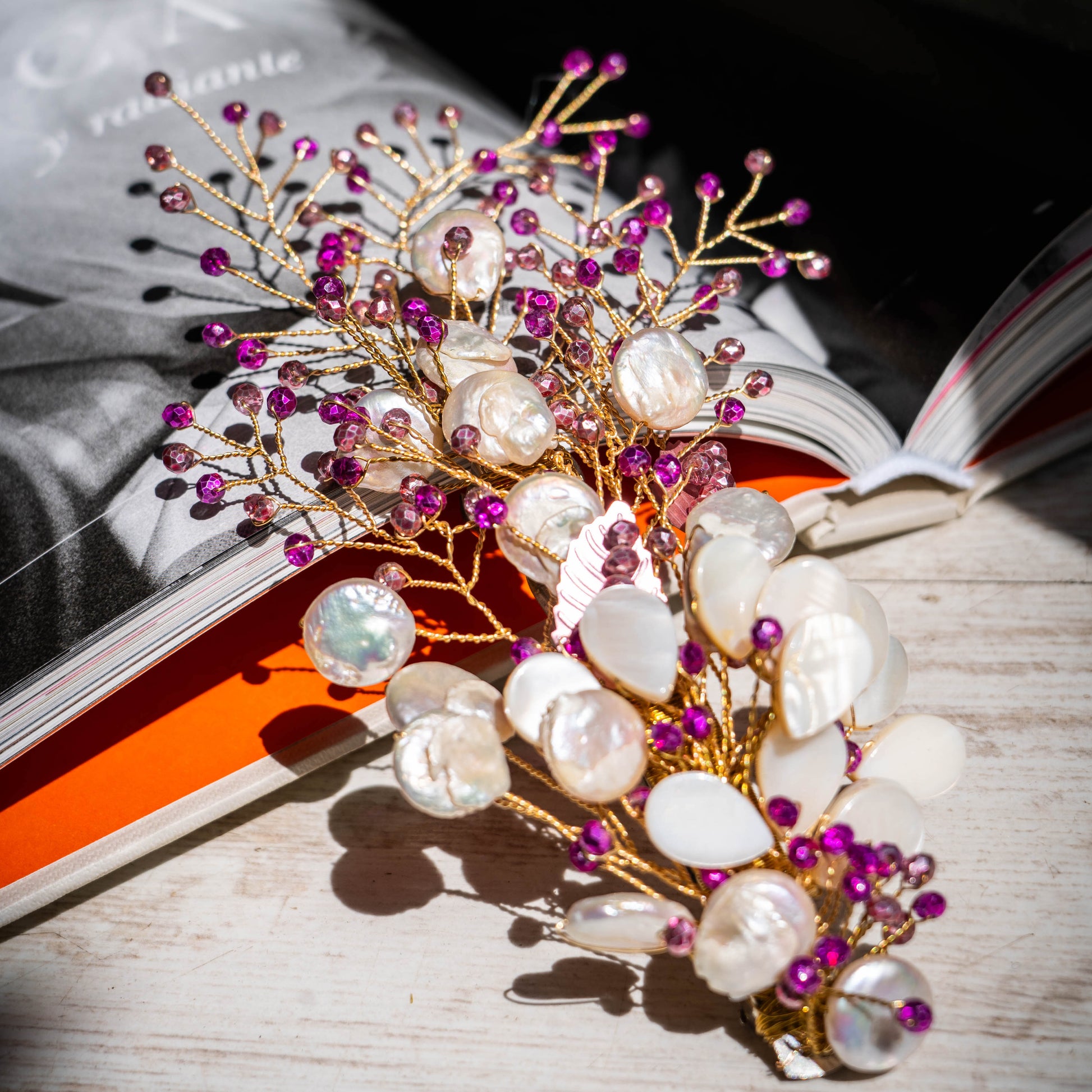 Traba, Nacar y Cristales Muy Trendy! Forrada con alambre dorado, y logrando un diseño de ramas con alambre dorado y cristales fucsia y rosa. Acompañado de nacar. Su uso es recogiendo el pelo, hacia un lado.
