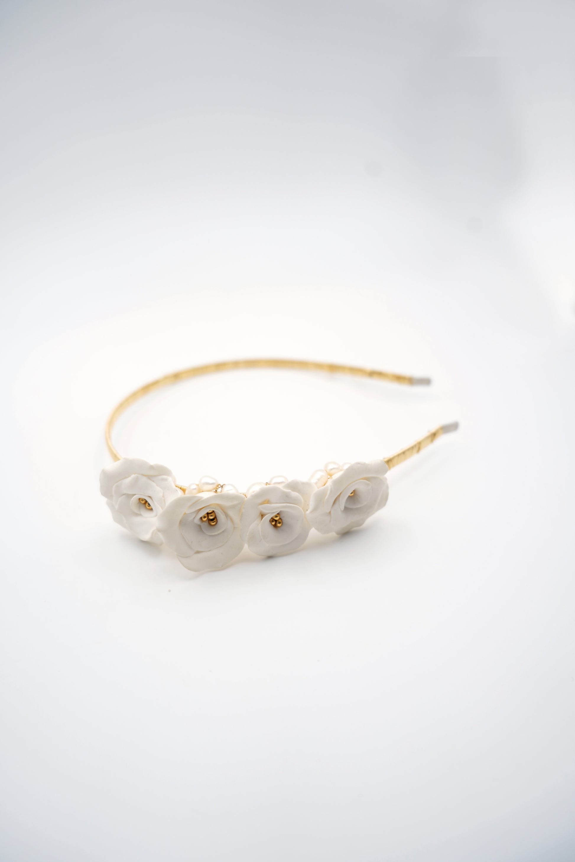 Sweet Sunshine es un tocado que de día y de noche te iluminara con un toque de simpleza, son solo cuatro flores a un costado rodeadas de perlas, en un cintillo dorado, que harán tu peinado algo único.